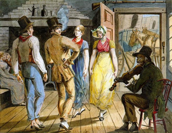 Keywords: 1812-Svinin-merrymaking-wayside-inn-USA.jpg Merrymaking at a Wayside Inn Shows Svinin's trip to the United States in the early 1810s This depicts travellers grabbing a hurried and impromptu dance on the road in early 1810's America in rural Pennsylvania in 1812 and so shows practices which would have been considered inelegant or shockingly informal in many socially genteel circles in Europe at the time such as smoking in the presence of ladies smoking indoors a man taking off his tailcoat in the presence of ladies -- leaving him wearing only his waistcoat and shirt on top -- and holding onto one's horsewhip while dancing Only one of the women has bothered to take off her bonnet One of the dancing men isn't wearing socks/stockings At left a couple is indulging in what could be considered an inappropriate public display of affection by some European standards of etiquette while at right a black fiddler provides the music for the dance Wagons can be seen outside the door Pavel Petrovich Svinin was a Russian who visited the United States as secretary to the Russian diplomatic representative in the early 1810's during which he painted a number of watercolors of life in America Later he published the book Voyage Pittoresque Aux Etats-Unis de l'Amérique par Paul Svignine en 1811 1812 et 1813 Voyage Pittoresque Aux Etats-Unis de l'Amérique par Paul Svignine en 1811 1812 et 1813 PD-old-auto 1839 Dance in paintings United States in the 1810s 1810s fashion African Americans in 19th-century art Svinyin Watercolor paintings of people 19th-century paintings of tavern interiors Etiquette in art Tailcoats Fiddlers from the United States 1810s music Paintings of the United States 19th-century paintings of musicians Pavel Svinyin Dance in the 1810s |