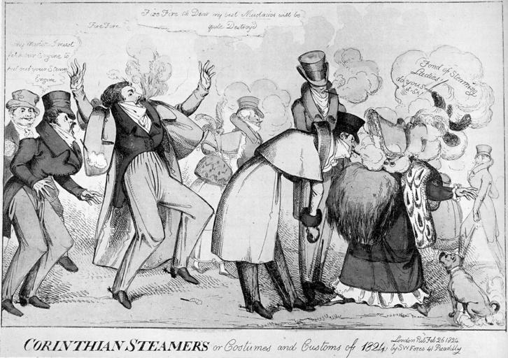 | Keywords: 1824-smoking-Heath-caricature.jpg Corinthian Steamers or Costumes and Customs of 1824 a Feb 26 1824 caricature by W Heath showing a dandy's moustache catching on fire and another dandy behaving in shocking violation of etiquette This shows the very beginnings of the transition from Regency to Victorian attitudes with respect to facial hair and smoking both of which were considered outlandish and un-English during the Regency and are ridiculed here but later would come to be considered highly respectable during the Victorian period Male facial hair was not yet considered fully respectable and moustaches were associated with foreign continental European and military influences at the time and so had a secondary association with conspicuous dandyism Corinthian was another word for dandy At the right of the image a dandy is blowing smoke in a lady's face in flagrant violation of the etiquette of the time in which smoking was mostly not done indoors at all and never done in the presence of ladies Text in image ;Flaming dandy 2nd from left Fire Fire oh Dear my best Mustacios will be quite Destroyd ;Alarmed dandy next to left Fire Fire ;Fireman at left My Master I must fetch our Engine to put out your Steam Engine ;Caption on cloud at center-right Fond of Steaming Ladies do you smoke it eh The steam engine was a shiny new technology in 1824 so smokers are jocularly compared to steam-engines Scanned by H Churchyard from Dorothy George's Hogarth to Cruikshank 1824-02-26 W Heath PD-old-100 1824 cartoons Caricatures of fashion Caricatures of smoking Fashion in 1824 Dandies Etiquette in art William Heath artist |