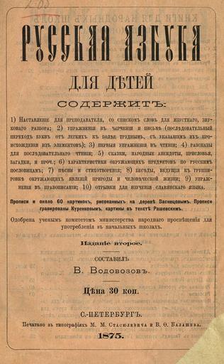 | Keywords: Водовозов, Василий Иванович (1825-1886). Русская азбука для детей.jpg ru Титульный лист книги Водовозова Василия Ивановича 1825-1886 «Русская азбука для детей» П описи и около 50 ка тинок ис на де Васнецовым / Сост В Водовозов; П описи г ав Ку енковым ка тины в тексте Рашевским 2-е изд Санкт-Пете бу г тип В С Балашева и Стасюлевича 1875 2 IV 105 с ил ; 20 1875 Российская Госуда ственная Библиотека Элект онная библиотека http //dlib rsl ru Водовозов Василий Иванович 1825-1886 PD-1923 PD-old-70-1923 Uploaded with UploadWizard Schoolbooks from Russia The First Saint-Petersburg Gymnasium St Petersburg Russia Vasily Vodovozov |