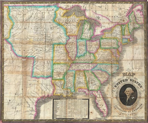| Keywords: 1835 Webster Map of the United States - Geographicus - UnitedStates-webster-1835.jpg An exceptional and rare map of the United States published by James Webster in 1835 Extends from the east coast of the United States westward as far as the Rocky Mountains including much of Texas This map of the United States is heavily based upon Humphrey Phelps ™ 1832 map of the same name In fact a close examination of the copyright data in the lower right hand corner seem to suggest that Webster simply scratched out Phelps ™ name and the date 1832 in order to replace it with his own and the date 1834 We can assume that Webster must have either picked up a discarded Phelps plate purchased the plate or simply stole it One of the most elegant features of this map is the portrait of George Washington engraved as part of the title cartouche in the lower right hand quadrant Probably the work of the prominent engraver William Chapin whose name appears just to the right of Florida this charming portrait is a remarkable piece of engraving To achieve this result Chapin combines several different engraving styles including an attractive application of both stipple and line technique Cartographically offers numerous elements of interest Predates the formation of the Republic of Texas by one year however does mention the region while including with Mexico Much of the western part of this map is dominated by an expansive Missouri Territory extending from Texas north to British America Canada and west as far as the Rocky Mountains Shows the course and numerous tributaries of the Missouri River as well numerous American Indian tribes throughout the region Also shows the smaller Missouri State as it was admitted to the Union in 1821 To the south Arkansas remains a territory though it would join only one year later in 1836 Wisconsin Territory appears with the archaic French spelling Ouisconsin and includes Michigan ™s northern peninsula Lake Michigan itself is slightly malformed and distended on the vertical axis At the bottom center there is a population chart for each stat and many major cities Removed from but accompanied by its original binder in which we also find attached a fold out Traveller ™s Guide and Statistical View of the United States Here Webster again seems to have used a bit of legerdemain in absconding with and copyrighting in his own name S A Mitchell ™s 1832 Traveller ™s Guide Offers road distances notes on boat routes and population statistics for the entire United States The population chart notes whites free blacks and slaves Further notes illness and infirmities For example there were 650 deaf and dumb slaves in 1830 A truly remarkable compilation of data Both the map and the index sheet are signed by one J E Geiger of whom we can find no significant reference We cannot stress enough the rarity of this particular publication David Rumsey who has the 1836 edition assumed it was one shot issue The 1835 edition of this antique map rarely appears and we can find reference to it in only one major collection 1835 dated Size in 19 5 16 5 object history credit line accession number UnitedStates-webster-1835 Geographicus-source PD-art Old maps of the United States United States in the 19th century 1835 maps Portraits of George Washington Maps in English |