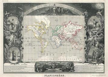 Keywords: 1847 Levasseur Map of the World - Geographicus - Planisphere-levassuer-1847.jpg This is a rare 1847 map of the world by French map publisher Victor Levasseur Probably Levassuer ™s most sought after atlas map Depicts the world on a Mercator projection with continents and some countries defined with outline color Offers a few elements of geographical interest This map shows the Oregon-Canada border extending northward into what is today British Columbia along the 54°40' north parallel Map layout if not the map itself predates acquisition of California and Texas by the United States Traces of Antarctica appear along the bottom of the map where various explorers sighted land The entire map is surrounded by a fantastic allegorical border typical of Levasseur ™s Atlas Illustre Designed by Raimond Bonheur father of the famous French artist Rosa Bonheur this is one of the most fantastic border designs to appear in any 19th century map The map proper is flanked on either side by figures representing the four seasons At the top of the map stars dot the firmament behind the arc of the Zodiac Under the Zodiac Adam and Even appear hand in hand walking toward a four breasted female figure possibly Pandora holding a box Below the map Jesus sits enthroned with Moses the Pyramids of Egypt a domed hall and other figures to either side Text at the base of the map describes each of the five recognized continents Prepared by V Levassuer from his office at 43 Rue St Jacques Paris for issue as plate no 1847 undated Size in 16 5 12 object history credit line accession number Planisphere-levassuer-1847 Levassuer V <i>Atlas National Illustre des 86 Departements et des Possessions de La France</i> 1847 edition Geographicus-source PD-old-100 Victor Levasseur - Maps of the world 1840s maps of the world 1847 maps Four Seasons Zodiac diagrams Engravings of Adam and Eve Engravings of Jesus Christ Christ in Majesty Maps in French Moses enthroned |