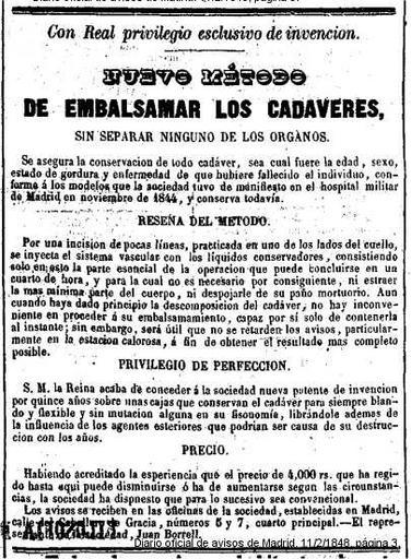 Keywords: 1848-embalsamar-cadaveres.jpg it Annuncio pubblicitario relativo a un nuovo metodo per imbalsamare i cadaveri senza separare alcun organo 11 2 1848 Diario oficial de Avisos de Madrid 11 2 1848 pag 3 Albertomos Con Real privilegio esclusivo de invencion Nuevo metodo de embalsamar los cadaveres sin separar ninguno de los organos Se asegura la conservacion de todo cadaver sea lo cual fuere la edad sexo estado de gordura y enfermedad de que hubiere fallecido el individuo conforme a los modelos que la sociedad tuvo de manifiesto en el hospital militar de Madrid en noviembre de 1844 y conserva todavia RESENA DEL METODO Por una incision de pocas lineas practicada en uno de los lados del cuello se inyecta el sistema vascular con los liquidos conservadores consistiendo solo en eso la parte esencial de la operacion que puede concluirse en un cuarto de hora y para la cual no es necesario por consiguiente ni estrar la mas minima parte del cuerpo ni despojarle de su paño mortuorio Aun cuando haya dado principio la descomposicion del cadaver no hay inconveniente en proceder a su embalsamamiento capaz por si solo de contenerla al instante; sin embargo serà util que no retarden los avisos particularmente en la estacion calorosa a fin de obtener el resultado mas completo posible PRIVILEGIO DE PERFECTION S M la Reina acaba de conceder a la sociedad nueva patente de invencion por quince años sobre unas cajas que conservan el cadaver para siempre blando y flexible y sin mutacion alguna en su fisionomia librandole ademas de la influencia de los agentes esteriores que podrian ser causa de su destruccion con los años PRECIO Habiendo acreditado la esperiencia que el precio de 4 000 rs que ha regido hasta aqui puede desminuirse ò ha de aumentarse segun las circustancias la sociedad ha dispuesto que para lo sucesivo sea convencional Los avisos se reciben en las oficinas de la sociedad establecidas en Madrid calle del Caballero de Gracia numero 5 y 7 cuarto principal - El representante de la sociedad Juan Borrell PD-old Uploaded with UploadWizard 1848 advertisements in Spain Diario oficial de Avisos de Madrid advertisements Undertakers advertisements ImageNote 1 24 20 349 504 405 551 2 Con Real privilegio esclusivo de invencion Nuevo metodo de embalsamar los cadaveres sin separar ninguno de los organos Se asegura la conservacion de todo cadaver sea lo cual fuere la edad sexo estado de gordura y enfermedad de que hubiere fallecido el individuo conforme a los modelos que la sociedad tuvo de manifiesto en el hospital militar de Madrid en noviembre de 1844 y conserva todavia RESENA DEL METODO Por una incision de pocas lineas practicada en uno de los lados del cuello se inyecta el sistema vascular con los liquidos conservadores consistiendo solo en eso la parte esencial de la operacion que puede concluirse en un cuarto de hora y para la cual no es necesario por consiguiente ni estrar la mas minima parte del cuerpo ni despojarle de su paño mortuorio Aun cuando haya dado principio la descomposicion del cadaver no hay inconveniente en proceder a su embalsamamiento capaz por si solo de contenerla al instante; sin embargo serà util que no retarden los avisos particularmente en la estacion calorosa a fin de obtener el resultado mas completo posible PRIVILEGIO DE PERFECTION S M la Reina acaba de conceder a la sociedad nueva patente de invencion por quince años sobre unas cajas que conservan el cadaver para siempre blando y flexible y sin mutacion alguna en su fisionomia librandole ademas de la influencia de los agentes esteriores que podrian ser causa de su destruccion con los años PRECIO Habiendo acreditado la esperiencia que el precio de 4 000 rs que ha regido hasta aqui puede desminuirse ò ha de aumentarse segun las circustancias la sociedad ha dispuesto que para lo sucesivo sea convencional Los avisos se reciben en las oficinas de la sociedad establecidas en Madrid calle del Caballero de Gracia numero 5 y 7 cuarto principal - El representante de la sociedad Juan Borrell ImageNoteEnd 1 |