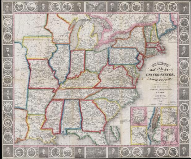 | Keywords: 1848 Phelps National Map of the United States (pocket map) - Geographicus - UnitedStates-phelps-1848.jpg This is a rare 1848 issue of the first state of Phelps ™s map of the United States Covers most of the eastern portion of the United States bounded on the west by Texas and two large unnamed territories to the north Insets in the lower right quadrant illustrate seven important port cities New York Philadelphia Baltimore Boston Birmingham Cincinnati St Louis and Chicago Two smaller map insets depict southern Florida and Northern Maine the extremes of both of which are just off the map The whole is surrounded by a fine decorative border depicting 30 alternating state seals and 16 important historical figures The state seal of Texas appears in the upper left quadrant but California ™s does not Shows the Trader ™s Route to Santa Fe as it passes through Missouri and the territory to the west Liberally names numerous American Indian tribes as well as Indian Burial Grounds and trading depots Ensign and Thayer issued a similar map in the same year that differs from this one only in that a Pittsburgh Inset is substituted for the Philadelphia Inset Later editions published after 1849 replace all seven city plans with a mini-map of the western United States There is also a German language edition issued in 1849 This map was issued as an accompaniment to Phelps ™s Travellers ™ Guide through the United States; containing Upwards of seven hundred Rail-road Canal and Stage and Steam-boat Routes accompanied with a New Map of the United States This 70 page booklet is bound in red leather with an elaborate cover design stamped in gold gilt Book features an index of place names as well as mileage charts between important cities on rail and stage routes This original booklet is included with this item Drawn and engraved by J M Atwood of New York Portraits and state seals engraved by William D Smith The copyright reads Entered according to Act of Congress in the year 1845 by H Phelps in the Clerks office of the District Court of the Southern District of N York 1848 dated Size in 25 5 21 object history credit line accession number UnitedStates-phelps-1848 Hand Color Geographicus-source PD-art Transport maps of the United States 1848 maps Eastern United States 1848 Old maps of the United States Old maps of cities in the United States Portraits of men of the United States Historical territorial and state seals of the United States Great Seal of the United States United States Declaration of Independence Maps in English |