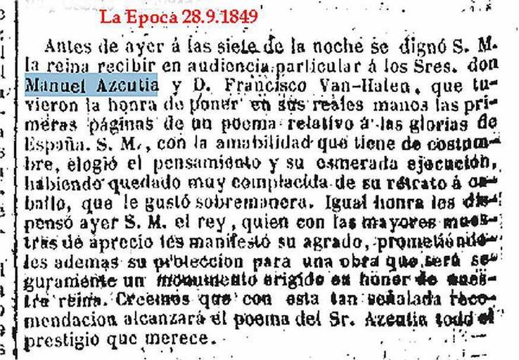 Keywords: 1849-Manuel-Azcutia-audiencia-particular.jpg es Antes de ayer a las siete de la noche se dignò S M La reina recibir en audencia particular a los Sres Don Manuel Azcutia y D Francisco Van-Halen que tuvieron la honra de poner en sus reales manos las primeras paginas de un poema relativo a las glorias de España S M con la amabilidad que tiene de costumbre elogiò el pensamiento y su esmerada ejecucion habiendo quedado muy complacida de su retrato a caballo que le gustò sobremanera Igual honra les dispenso ayer S M el rey quien con las mayores muestras de aprecio les manifestò su agrado prometiendoles ademas su proteccion para una obra que serà seguramente un monumento erigido en honor de nuestra reina Creemos que con esta tan señalada recomendacion alcanzaarà el poema del sr Azcuti todo el prestigio que merece 1849-09-28 La Epoca Madrid 28 9 1849 La Epoca other versions PD-old Uploaded with UploadWizard La Epoca Madrid Manuel Lopez de Azcutia 1849 in Madrid
