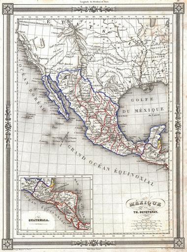 Keywords: 1852 Duvotenay Map of Mexico ( includes Texas and Upper California ) - Geographicus - Mexique-duvotenay-1852.jpg An uncommon and extremely attractive 1852 map of the Mexico by Th Duvotenay Includes all of modern day Mexico as well as Texas and the territories Upper California claimed by Mexico prior to the 1849 Treaty of Guadaloupe-Hildago Shows the Mexico “ U S Boundary line prior to the Gadsden Purchase Offers a number of fascinating elements including pre-Fremont cartography in Upper California The fictional rivers Jesus Maria and Wimmetchke are shown extending eastward from San Francisco Bay Labels the Great Salt Lake as Lake Teguayo after José Antonio de Alzate y RamÃrez Lake Teguayo is said by some to be the legendary homeland of the Aztecs To the north of Lake Teguayo today ™s Lake Utah is labeled Lake Timpanogos Texas appears at its fullest extent Mexico itself is divided into its various intendancies An inset in the lower left quadrant focuses on Guatemala Features a beautiful frame style border Prepared by Th Duvotenay for publication as plate no 31 in Maison Basset ™s 1852 edition of the Atlas Illustre 1852 undated Size in 9 12 5 object history credit line accession number Mexique-duvotenay-1852 Maison Basset <i>Atlas Illustre</i> 1852 issue Geographicus-source PD-art Old maps of Mexico Thunot Duvotenay Old maps of Central America 1852 maps Maps in French |