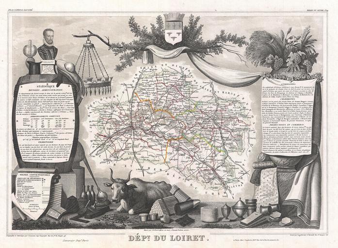 | Keywords: 1852 Levasseur Map of the Department Du Loiret, France - Geographicus - Loiret-levasseur-1852.jpg This is a fascinating 1852 map of the French department of Loiret France Surrounding the city of Orleans Loiret is considered the heart of France and is a registered Unesco World Heritage Site This area of France is also part of the Loire Valley wine region and is especially known for its production of Pinot Noirs and Gris Meuniers in the Orleans area The map proper is surrounded by elaborate decorative engravings designed to illustrate both the natural beauty and trade richness of the land There is a short textual history of the regions depicted on both the left and right sides of the map Published by V Levasseur in the 1852 edition of his Atlas National de la France Illustree 1852 undated Size in 16 5 11 5 object history credit line accession number Loiret-levasseur-1852 Levassuer V <i>Atlas National Illustre des 86 Departements et des Possessions de La France Divise par Arrondissements Cantons et Communea avec La Trace de Toutes Les Routes Chemins de fer et Canaux </i> 1852 edition Geographicus-source PD-old-100 Victor Levasseur - Maps of France France 1852 maps France Old maps of Loiret |