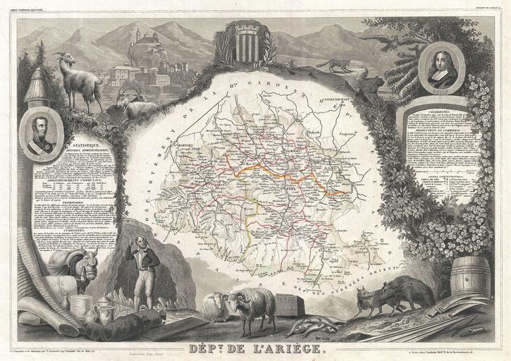 | Keywords: 1852 Levasseur Map of the Department Ariege, France (Bethmale, Bamalous, Moulis and Rogallai cheese - Geographicus - Ariege-levasseur-1852.jpg This is a fascinating 1857 map of the French department of Ariege France This area of France is known for its production of semi-soft and mild cheeses such as Bethmale Bamalous Moulis and Rogallai The whole is surrounded by elaborate decorative engravings designed to illustrate both the natural beauty and trade richness of the land There is a short textual history of the regions depicted on both the left and right sides of the map Published by V Levasseur in the 1852 edition of his Atlas National de la France Illustree 1852 undated Size in 16 11 5 object history credit line accession number Ariege-levasseur-1852 Levassuer V <i>Atlas National Illustre des 86 Departements et des Possessions de La France Divise par Arrondissements Cantons et Communea avec La Trace de Toutes Les Routes Chemins de fer et Canaux </i> 1852 edition Geographicus-source PD-old-100 Victor Levasseur - Maps of France 1852 in Ariège 1852 works in France 1852 maps Old maps of Ariège Maps in French Château de Foix Coats of arms of Foix Bertrand Clauzel Pierre Bayle Engravings of animals Phrygian caps Animals on maps Maps of the history of Foix |