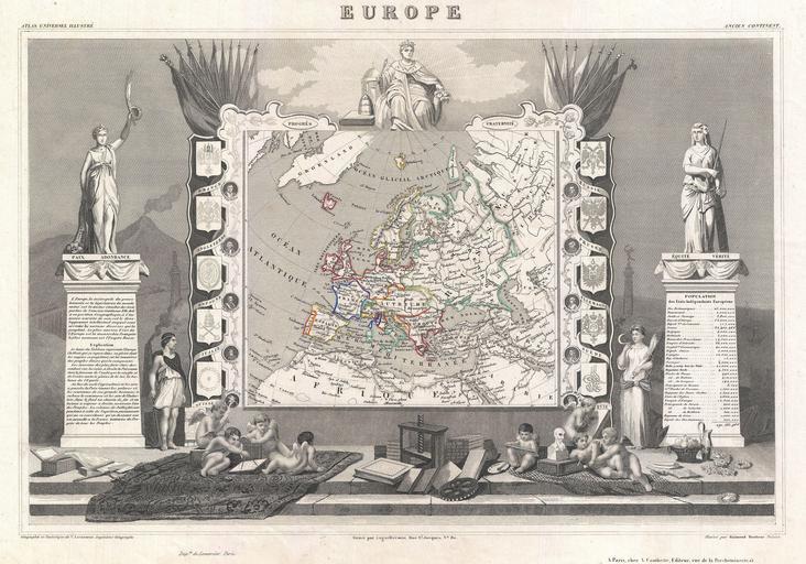 Keywords: 1852 Levasseur Map of Europe - Geographicus - Europe-levasseur-1852.jpg A fine example of V Levasseur's desirable decorative map of Europe dated 1852 Shows the entire continent according to political situation of the time The whole is surrounded by elaborate decorative engravings designed to illustrate cultural heritage of the continent Shows the armorial crests of France England Spain Italy Switzerland Russia Prussia Germany Sweden and Turkey There is a short textual history of the region depicted on both the left and right sides of the map Published by V Levasseur in the 1852 edition of his Atlas National de la France Illustree 1852 undated Size in 17 5 12 75 object history credit line accession number Europe-levasseur-1852 Levassuer V <i>Atlas National Illustre des 86 Departements et des Possessions de La France Divise par Arrondissements Cantons et Communea avec La Trace de Toutes Les Routes Chemins de fer et Canaux </i> 1852 edition Geographicus-source PD-old-100 Victor Levasseur - Maps of the world Old maps of Europe 1852 maps Historical coats of arms Putti Unidentified allegories