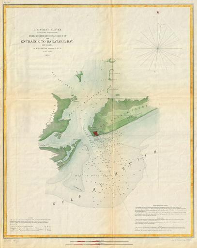 Keywords: 1853 U.S. Coast Survey Map or Chart of Bartaria Bay, Louisiana - Geographicus - BaratariaBay-uscs-1853.jpg This is an attractive 1853 U S Coast Survey chart or nautical map or Barataria Bay Louisiana Covers from Grand Isle and Bayou Rigaud eastward Past Fort Livingston and Forstall ™s Plantation Extends northward past Mendicant Island to Independence Island and the Bay aux Chats Includes notes on tides in the lower left hand quadrant and sailing instructions in the lower right Barataria Bay just south of New Orleans is part of the series of swamps bays and canals that make up the Mississippi River Delta In the early 19th century this bay used as the base of the privateers led by Jean Lafitte Today the bay is known for its rich resources most notably shrimp and sulfur muskrat furs natural gas and oil The cartography for this map was accomplished by F H Gerdes under the supervision of A D Bache director of the U S Coast Survey 1853 dated Size in 14 17 object history credit line accession number BaratariaBay-uscs-1853 <i>Report of the Superintendant of the U S Coast Survey </i> 1853 edition Geographicus-source PD-art United States Coast Survey maps Old maps of Louisiana 1853 maps 1853 in Louisiana Fort Livingston Louisiana |