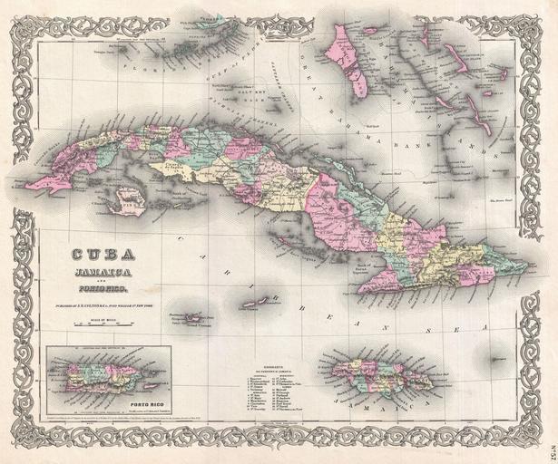 Keywords: 1855 Colton Map of Cuba, Jamaica and Porto Rico - Geographicus - Cuba-colton-1855.jpg A beautiful 1855 first edition example of Colton's map of Cuba Jamaica Porto Rico and the Bahamas Centered on Cuba this map extends north to include the Florida Coast and New Providence Island extends south as far A Jamaica Includes the Cayman Islands and a detailed inset of Porto Rico in the lower left quadrant Like most of Colton's North America maps this map is largely derived from an earlier wall map of North America produced by Colton and D Griffing Johnson Colton identifies various cities towns forts rivers rapids fords and an assortment of additional offshore and topographical details Map is hand colored in pink green yellow and blue pastels to define national and regional boundaries Surrounded by Colton's typical spiral motif border Dated and copyrighted to J H Colton 1855 Published from Colton's 172 William Street Office in New York City Issued as page no 57 in volume 1 of the first edition of George Washington Colton's 1855 Atlas of the World 1855 dated Size in 16 13 object history credit line accession number Cuba-colton-1855 Colton G W <i>Colton's Atlas of the World Illustrating Physical and Political Geography</i> Vol 1 New York 1855 First Edition Geographicus-source PD-old-100 Maps by Joseph Hutchins Colton Old maps of Jamaica Old maps of Cuba 1855 maps Spanish colonial period in Cuba |