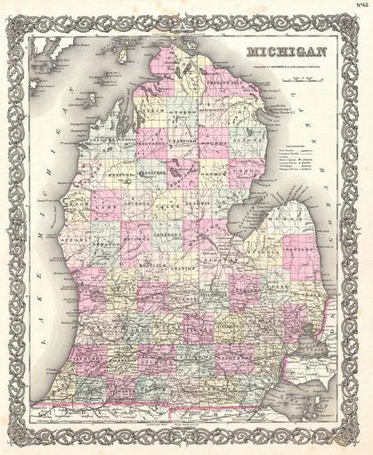 Keywords: 1855 Colton Map of Michigan - Geographicus - Michigan-colton-1855.jpg A beautiful 1855 first edition example of Colton's map of Michigan Covers lower part of the state bounded by Lake Michigan on the west and Lake Huron on the east Like most of Colton's state maps this map is largely derived from an earlier wall map of North America produced by Colton and D Griffing Johnson Colton identifies various cities towns forts rivers rapids fords and an assortment of additional topographical details Map is hand colored in pink green yellow and blue pastels to define county and state boundaries Surrounded by Colton's typical spiral motif border Dated and copyrighted to J H Colton 1855 Published from Colton's 172 William Street Office in New York City Issued as page no 42 in volume 1 of the first edition of George Washington Colton's 1855 Atlas of the World 1855 dated Size in 13 16 object history credit line accession number Michigan-colton-1855 Colton G W <i>Colton's Atlas of the World Illustrating Physical and Political Geography</i> Vol 1 New York 1855 First Edition Geographicus-source PD-old-100 Maps by Joseph Hutchins Colton Old maps of Michigan 1855 maps |