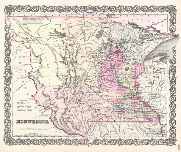 Keywords: 1855 Colton Map of Minnesota - Geographicus - Minnesota-colton-1855.jpg A beautiful 1855 first edition first state example of Colton's map of Minnesota This is one of the rarest and most desirable of all Colton atlas maps Like most of Colton's state maps this map was derived from an earlier wall map of North America produced by Colton and D Griffing Johnson Covers territorial Minnesota which included modern day North and South Dakota When the map was drawn only a small portion of southeastern Minnesota hand been plated for settlement the remainder of the territory was dominated by a number of large and powerful American Indian nations These included the Yanktonnan and Chippewa Identifies the Chippewa and Long Prairie Indian Agencies Also offers notes on the salinity of various lakes in the region and the locations of trading posts such as the Scottsman Martin McLeod's Trading Post on the Minnesota River This map further identifies various forts rivers rapids fords and an assortment of additional topographical details Map is hand colored in pink green yellow and blue pastels to define territory and state boundaries Surrounded by Colton's typical spiral motif border Dated and copyrighted to J H Colton 1855 Published from Colton's 172 William Street Office in New York City Issued as page no 49 in volume 1 of the first edition of George Washington Colton's 1855 Atlas of the World 1855 dated Size in 16 13 object history credit line accession number Minnesota-colton-1855 Colton G W <i>Colton's Atlas of the World Illustrating Physical and Political Geography</i> Vol 1 New York 1855 First Edition Geographicus-source PD-art Maps by Joseph Hutchins Colton Old maps of Minnesota 1855 maps |