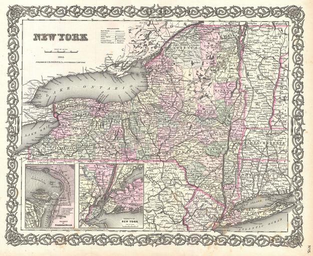 Keywords: 1855 Colton Map of New York - Geographicus - NewYork-colton-1855.jpg A beautiful 1855 first edition example of Colton's map of New York Covers the entire state as well as adjacent parts of the adjacent states Like most of Colton's state maps this map is largely derived from an earlier wall map of North America produced by Colton and D Griffing Johnson Colton identifies various cities towns forts rivers rapids fords and an assortment of additional topographical details Two insets in the lower left quadrant detail Niagara Falls and the vicinity of New York City Map is hand colored in pink green yellow and blue pastels to define county and state boundaries Surrounded by Colton's typical spiral motif border Dated and copyrighted to J H Colton 1855 Published from Colton's 172 William Street Office in New York City Issued as page no 15 in volume 1 of the first edition of George Washington Colton's 1855 Atlas of the World 1855 dated Size in 16 13 object history credit line accession number NewYork-colton-1855 Colton G W <i>Colton's Atlas of the World Illustrating Physical and Political Geography</i> Vol 1 New York 1855 First Edition Geographicus-source PD-old-100 Maps by Joseph Hutchins Colton Old maps of New York 1855 maps |