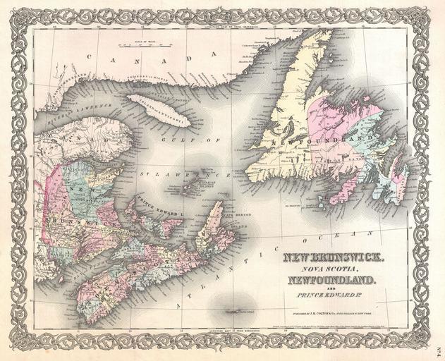 | Keywords: 1855 Colton Map of New Brunswick, Nova Scotia, Newfoundland and Price Edward Island - Geographicus - NovaScotia-colton-1855.jpg An excellent first edition example of Colton's rare 1855 map of the Maritime Provinces of New Brunswick Nova Scotia Newfoundland and Prince Edward Island Throughout the map Colton identifies various cities towns forts rivers rapids fords and an assortment of additional topographical details Map is hand colored in pink green yellow and blue pastels to define national and regional boundaries Surrounded by Colton's typical spiral motif border Dated and copyrighted to J H Colton 1855 Published as page no 4 in volume 1 of the first edition of George Washington Colton's 1855 Atlas of the World 1855 dated Size in 16 13 object history credit line accession number NovaScotia-colton-1855 Colton G W <i>Colton's Atlas of the World Illustrating Physical and Political Geography</i> Vol 1 New York 1855 First Edition Geographicus-source PD-old-100 Maps by Joseph Hutchins Colton Old maps of the Gulf of Saint Lawrence Old maps of New Brunswick Old maps of Nova Scotia Old maps of Newfoundland Old maps of Prince Edward Island 1855 maps of Canada |