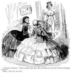 Keywords: 1857-regency-fashion-crinoline-comparison-joke.png A satirical cartoon from the July 11th 1857 issue of Harper's Weekly New York on the difference between Regency clothing styles of the early 1800's and the Victorian fashions of the time Two girls or young women of 1857 wearing full crinolines are viewing a painting of a woman in early nineteenth-century neo-Grecian attire Caption ARABELLA MARIA Only to think Julia dear that our Mothers wore such ridiculous fashions as these BOTH Ha ha ha ha Actually it would more probably have been their grandmothers Harper's Weekly Scanned by H Churchyard 1857-07-11 unknown 1857 artist PD-old-70-1923 1800s fashion Fashion in 1857 Black and white drawings of dresses Caricatures of crinolines Line art of women Harper's Magazine 11 July 1857 cartoons 02 03 04 19th-century satirical art works New and old fashion in art |