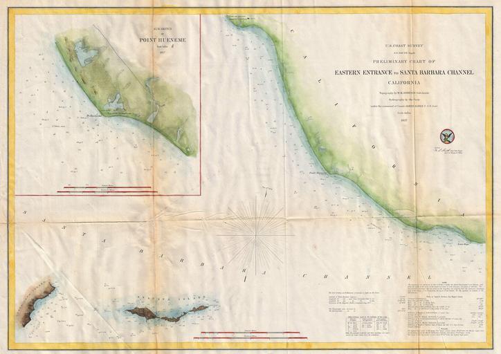 | Keywords: 1857 U.S. Coast Survey Map of the Eastern Entrance to Santa Barbara Channel - Geographicus - SantaBarbaraChanne-uscs-1857.jpg An extremely attractive hand colored 1857 U S Coast Survey chart or map of the Eastern Entrance to Santa Barbara Channel Depicts the California coast from the Town and Mission of San Buenaventura Ventura CA to Point Mugu Includes Santa Cruz Island and Anacapa Island An inset map in the upper left quadrant details Point Hueneme Port Hueneme and its vicinity The entire map offers numerous depth soundings Detailed information on Tides and Sailing instructions in the lower right quadrant The topography for the map was prepared by W M Johnson The hydrography was accomplished by a party under the command of James Alden Compiled under the direction of A D Bache Superintendent of the Survey of the Coast of the United States and one of the most influential American cartographers of the 19th century 1857 dated Size in 23 5 16 6 object history credit line accession number SantaBarbaraChanne-uscs-1857 <i>Report of the Superintendant of the U S Coast Survey </i> 1857 edition Geographicus-source PD-old-100 United States Coast Survey maps Point Hueneme Lighthouse 1857 maps Old maps of California |