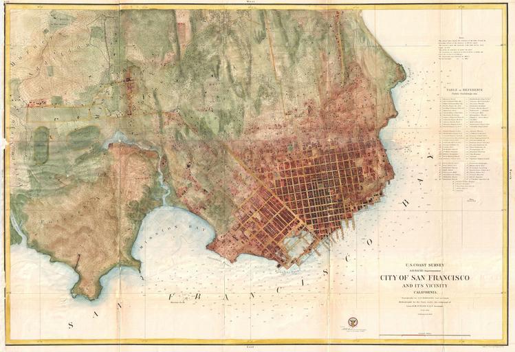 | Keywords: 1858 U.S. Coast Survey Chart or Map of San Francisco, Califorina - Geographicus - SanFrancisco-uscs-1859.jpg A rare coastal chart of San Francisco by the U S Coast Survey 1859 Oriented to the west this map depicts the immediate city of San Francisco and surrounding areas as far as the Mission de Dolores and Rancho San Miguel The chart was issued about ten years following the population explosion brought on by the 1849 gold Rush Depicts the city extending only about eleven city blocks from the waterfront Labels piers wharfs parks and roads as well as indicating important individual buildings such as the City Hall the Post Office hospitals and churches The Bay features detailed depth soundings Text on public buildings reservoirs sailing notes shoals and tidal notations are included on the top left and lower right hand corners of the map The work of the coast survey around the city of San Francisco was completed in 1852 and first known U S C S plan of the city and its immediate vicinity was published in the same year Rumsey suggests that the actual city plan was taken from an earlier map produced Cook and Le Count and Vogdes suggests that the interior topography is drawn from the Eddy's official map of San Francisco This first Coast Survey Chart of San Francisco was oriented to the north and covered a considerably small area than the map offered here The above chart was issued in 1857 to replace the 1853 chart and account for the rapid urbanization of the San Francisco vicinity Although much of the actual topography is based on the original 1853 map there are a number of important updates and expansions especially in the extreme eastern and southern quadrants The notation of the Union Race Course the Pioneer Race Course the Road to San Jose and the Rancho de San Miguel are but a few such additions Furthermore this map also features the addition of a Table of References to the right of the main map This numbered table identifies a number of important buildings throughout the city including churches theaters hotels fire houses hospitals and government buildings The trigonometrical survey for this map was prepared by R D Cutts The topography was accomplished by A F Rodgers and the hydrography by R M Cuyler Engraved by Julius Bien All work was produced under the supervision of A D Bache one of the most influential superintendents in the history of the U S Coast Survey 1859 dated Size in 35 24 object history credit line accession number SanFrancisco-uscs-1859 <i>Report of the Superintendant of the United States Coast Survey </i> Washington 1859 edition Geographicus-source PD-art United States Coast Survey maps 1859 maps 1859 in San Francisco Old maps of San Francisco Urbanization |