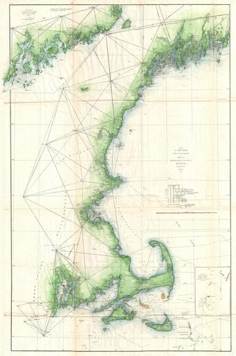 | Keywords: 1859 U.S. Coast Survey Map of the New England Coa - Geographicus - CapeCodtoMaine-uscs-1859.jpg An impressive and striking example of the U S Coast Survey ™s 1859 map or triangulation chart of the New England coastline Covers the coast line from Narraganset Bay Rhode Island eastwards past Martha ™s Vineyard and Nantucket then north to Cape Cod Boston Harbor Cape Anne Portsmith New Hampshire and Portland Maine Includes Boston City and Harbor Salem Provincetown Cape Ann Gloucester Newburyport Portsmouth and Portland among other towns A large inset map in the upper left quadrant focuses on Penobscot Bay This chart was prepared under the supervision of A D Bache one of the most influential and prolific Superintendents of the Coast Survey Issued in the 1859 Superintendent ™s Report 1859 dated Size in 24 36 object history credit line accession number CapeCodtoMaine-uscs-1859 <i>Report of the Superintendent of the United States Coast Survey </i> Washington 1859 Geographicus-source PD-art United States Coast Survey maps 1859 maps Old maps of Massachusetts Massachusetts Coast Triangulation |