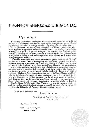 Keywords: Επιστολή - Απογραφή Ελλάδος 1861 - Γραφείον Δημοσίου Οικονομίας - 1862.jpg en Letter by the Office of Public Finance to the Minister of Interior informing of the successful completion of the 1861 Greece cencus el Ε ιστολή του Γραφείου Δημοσίου Οικονομίας ρος τον Υ ουργό Εσωτερικών σχετικά με την ε ιτυχή ολοκλήρωση της α ογραφής του 1861 στην Ελλάδα 1862 http //dlib statistics gr/portal/page/portal/ESYE/showdetails p_id 14327806 p_derive book Hellenic Statistical Authority Digital Library / ELSTAT - 1861 census report Office of Public Economy / Ministry of Interior Affairs - Kingdom of Greece - 1862 other versions cc-zero Book pages in Greek