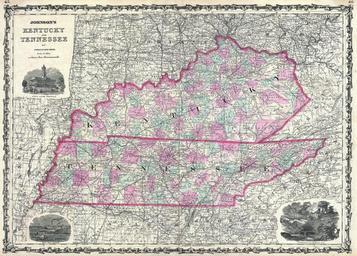 Keywords: 1862 Johnson Map of Kentucky and Tennessee - Geographicus - KTTN-johnson-1862.jpg A beautiful example of A J Johnson ™s 1862 map of Kentucky and Tennessee Probably the most decorative of Johnson ™s Kentucky-Tennessee series this rare map offers a fascinating snapshot of these secessionist states shortly following the outbreak of the American Civil War Map shows both states in full with color coding according to county Engraved decorative views of the State House Nashville the Navy Yard Memphis and the Entrance to the Mammoth Cave decorate the upper left lower left and lower right hand quadrants respectively Features the strapwork style border common to Johnson ™s atlas work from 1860 to 1863 Published by A J Johnson and Ward as plate numbers 45 and 46 in the 1862 edition of Johnson ™s New Illustrated Family Atlas This is the first edition of the Johnson ™s Atlas to bear the Johnson Ward imprint 1862 undated Size in 24 5 17 5 object history credit line accession number s Geographical Statistical and Historical </i> 1862 A J Johnson Ward edition Geographicus-source PD-old-100 Maps by Alvin Jewett Johnson 1862 maps Old maps of Kentucky Old maps of Tennessee |