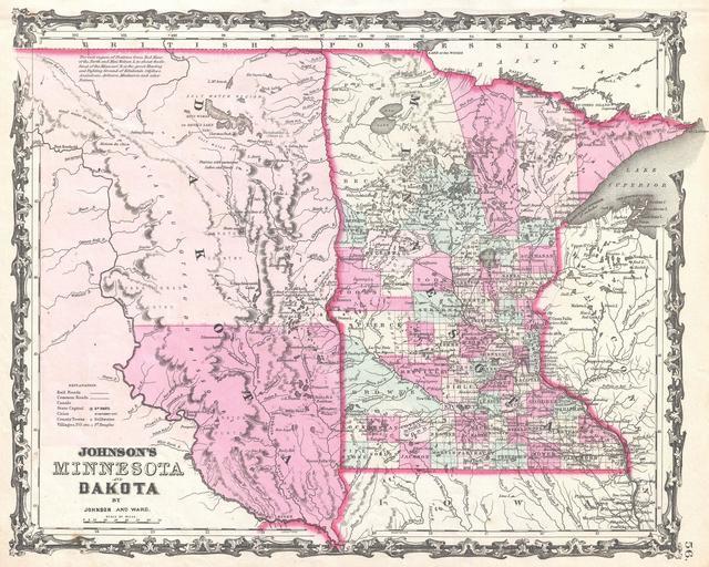 Keywords: 1862 Johnson Map of Minnesota and Dakota - Geographicus - MNDK-johnson-1862.jpg A beautiful example of A J Johnson ™s 1862 map of Minnesota and Dakota Covers both states as well as adjacent parts of Wisconsin and Iowa This map predates the splitting of the Dakotas and instead depicts them as a single great state bounded on the west by the Missouri River The proposed northern route for the Pacific Railroad runs diagonally in a northwesterly direction across both Minnesota and Dakota Offers color coding according to county and has notations for railways forts roadways cities towns and river systems Also notes several American Indian nations including the Kdakotah Odjibwe Assiniboin Aikara Minitarree and others Features the strapwork style border common to Johnson ™s atlas work from 1860 to 1863 Published by A J Johnson and Ward as plate number 56 in the 1862 edition of Johnson ™s New Illustrated Family Atlas This is the first edition of the Family Atlas to bear the Johnson and Ward imprint 1862 undated Size in 16 12 5 object history credit line accession number s Geographical Statistical and Historical </i> 1862 A J Johnson Ward edition Geographicus-source PD-old-100 Maps by Alvin Jewett Johnson 1862 maps Old maps of North Dakota Old maps of South Dakota Old maps of Minnesota Illustrated Historical Atlas of the State of Iowa |