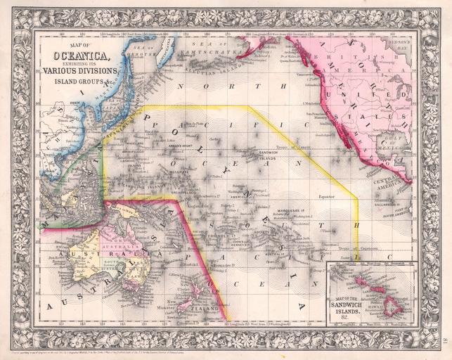 Keywords: 1864 Mitchell Map of Australia and Polynesia - Geographicus - Oceanica-mitchell-1864.jpg A beautiful example of S A Mitchell Jr ™s 1864 map of the Pacific including Australia Polynesia Melanesia and Malaysia Covers the region in considerable detail with parts of North America and Asia included Extends as far north as the Aleutian Islands and as far south as New Zealand Inset in the lower right quadrant depicts the Sandwich or Hawaiian Islands One of the most attractive American atlas maps of this region to appear in the mid 19th century Features the floral border typical of Mitchell maps from the 1860-65 period Prepared by S A Mitchell Jr for inclusion as plate 81 in the 1864 issue of Mitchell ™s New General Atlas Dated and copyrighted Entered according to Act of Congress in the Year 1860 by S Augustus Mitchell in the Clerk ™s Office of the District Court of the U S for the Eastern District of Pennsylvania 1860 dated Size in 13 5 11 object history credit line accession number Oceanica-mitchell-1864 <i>Mitchell's New General Atlas containing Maps of the Various Countries of the World Plans of Cities Etc Embraced in Fifty-three Quarto Maps forming a series of Eighty-Four Map and Plans together with Valuable Statistical Tables </i> 1864 Edition Geographicus-source PD-old-100 Maps by Samuel Augustus Mitchell Old maps of Asia |