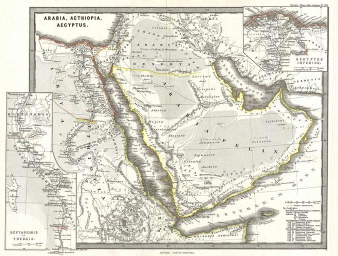 | Keywords: 1865 Spruner Map of Arabia and Egypt in Antiquity - Geographicus - Arabia-spruner-1865.jpg A particularly interesting historic map this is Karl von Spruner ™s 1865 rendering of Arabia Aethiopia Ethiopia and Egypt Aegyptus in antiquity Centered on the Red Sea or Mare Rubrum this map covers the entirety of the Arabian Peninsula the Persian Gulf and the Nile Valley as far south as Lake Tana Pseuba the source of the Blue Nile Like most of Spruner ™s work this map overlays ancient political geographies on relatively contemporary physical geographies thus identifying the sites of forgotten towns and villages the movements of armies and the disposition of lands in the region This particular example includes both ancient Latin and more contemporary Arabic names transliterated of course for many important regions and sites Additionally two inset maps are offered In the lower left hand quadrant a map labeled Heptanomis et Thebais focuses on the course of the Nile from Heptatnomis near Fayum south to just past modern day Aswan covering in the process many of the ancient Egyptian cities now submerged under the waters of Lake Nasser Another inset in the upper right quadrant focuses on the fertile Nile Delta forming an inverted triangle between Alexandria Memphis and Casluch As a whole the map labels important cities rivers mountain ranges and other minor topographical detail Territories and countries outlined in color The whole is rendered in finely engraved detail exhibiting the fine craftsmanship for which the Perthes firm is known 1865 undated Size in 16 13 object history credit line accession number Arabia-spruner-1865 Spruner Karl von <i>Spruner-Menke Atlas Antiquus </i> Gotha Justus Perthes 1865 Geographicus-source PD-old-100 Karl Spruner von Merz Old maps of the Middle East 1865 maps |