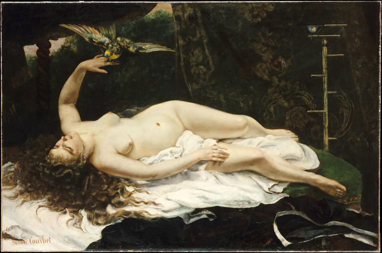 Keywords: 1866 Gustave Courbet - Woman with a Parrot.jpg Artwork Creator Gustave Courbet 1866 Oil on canvas cm 129 5 195 6 Institution Metropolitan Museum of Art Gallery 811 accession number 29 100 57 object history credit line H O Havemeyer Collection Bequest of Mrs H O Havemeyer 1929 66 / Gustave Courbet ~ lower left signature and date When this painting was shown in the Salon of 1866 critics censured Courbet's lack of taste as well as his model's ungainly pose and disheveled hair Clearly Courbet's woman was perceived as provocative The picture however was admired by contemporary artists Cézanne seems to have carried a small photograph of it in his wallet and in 1866 Manet began his version of the subject Young Lady in 1866 Woman with a Parrot MMA 89 21 3 29 100 57 PD-old-100-1923 Woman with a Parrot Courbet |