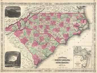Keywords: 1866 Johnson Map of North Carolina and South Carolina - Geographicus - Carolina-johnson-1866.jpg A beautiful example of A J Johnson ™s 1866 map of North Carolina and South Carolina Offers a fascinating snapshot of these states shortly following the close of the American Civil War Map shows both states in full with color coding according to county An inset map in the lower right hand quadrant depicts the city and harbor of Charleston Throughout Johnson identifies various cities towns rivers and assortment of additional topographical details Engraved views depicting the Chimney Rocks and French Broad River and Table Mountain decorate the upper left and lower left hand quadrants respectively Features the fretwork style border common to Johnson ™s atlas work from 1864 to 1869 Published by A J Johnson and Ward as plate numbers 39 and 40 in the 1866 edition of Johnson ™s New Illustrated Family Atlas This is the last edition of the Johnson ™s Atlas to bear the Johnson Ward imprint 1866 dated 1865 Size in 23 5 17 5 object history credit line accession number s Geographical Statistical and Historic including The Latest Federal Census A Geographical Index and a Chronological History of the Civil War in America</i> 1866 Geographicus-source PD-old-100 Maps by Alvin Jewett Johnson 1866 maps Old maps of North Carolina Old maps of South Carolina |