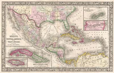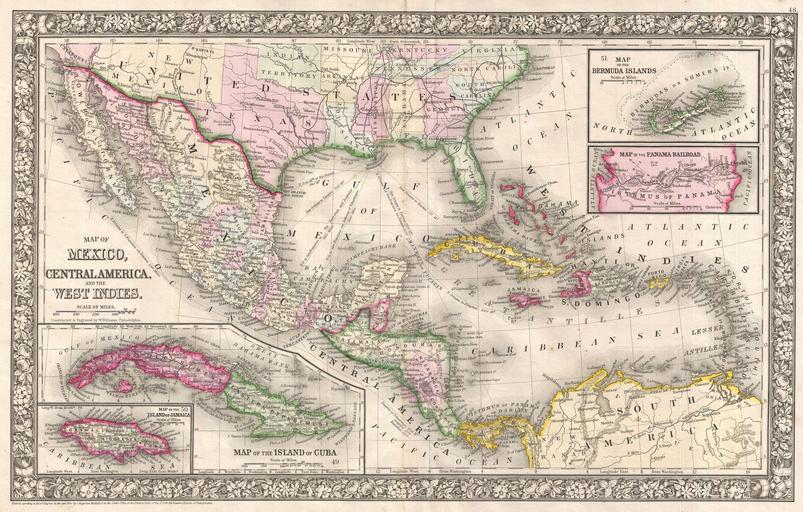 Keywords: 1866 Mitchell Map of Mexico and the West Indies - Geographicus - WestIndies-mitchell-1866.jpg A fine example of Mitchell ™s 1866 map of Mexico Central America and the West Indies Centered on New Orleans this map covers all of Mexico the West Indies the Gulf of Mexico the Caribbean Sea the Greater and Lesser Antilles the northern parts of South America and the southern parts of the United States including all of Texas and Florida The whole is color coded at the state and province level This map notes important nautical routes from New Orleans to various popular destinations including San Francisco Tampico the Rio Grande Veracruz Panama and Havana Features the floral border typical of Mitchell maps issued between 1860 and 1865 Features four inset maps The two maps in the lower left quadrant depict the Island of Jamaica and the Island of Cuba The two maps in the upper right quadrant feature the Bermuda Islands and the Isthmus of Panama Panama Railroad It is interesting to note that this map was not updated from the original 1860 issue to reflect the partitioning of New Mexico and Arizona in 1864 Mitchell may have used the left over printings of the 1860 issue of this map to populate his atlases until the late-1860s when he finally updated the plate All in all one of the most attractive American atlas maps of the world to appear in the mid-19th century Prepared by S A Mitchell for inclusion as plate nos 48-52 in the 1866 issue of Mitchell ™s New General Atlas Dated and copyrighted Entered according to Act of Congress in the Year 1860 by S A Mitchell Jr in the Clerk ™s Office of the District Court of the U S for the Eastern District of Pennsylvania 1866 dated 1860 Size in 21 5 13 5 object history credit line accession number WestIndies-mitchell-1866 Mitchell Jr S A <i>Mitchell's New General Atlas containing Maps of the Various Countries of the World Plans of Cities Etc Embraced in Fifty-Five Quarto Maps Forming a series of Eighty-Seven Maps and Plans Together with Valuable Statistical Tables </i> Philadelphia 1866 Geographicus-source PD-old-100 Maps by Samuel Augustus Mitchell Old maps of Mexico Old maps of Central America Old maps of the Caribbean 1866 maps |