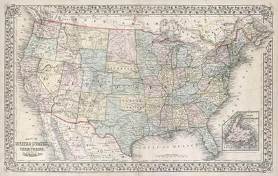 | Keywords: 1867 Mitchell Map of the United States - Geographicus - UnitedStates-mitchell-1867.jpg A fine example of Mitchell ™s 1867 map of the United States Depicts the entirety of the continental United States along with parts of Canada and Mexico Shows the country in considerable detail with notations regarding railroads mail routes including the famed Pony Express Route emigrant routes westward topographical and political details Represents the 1867 state of the map in which the western states appear much as they do today with but two notable exceptions Wyoming retains its western panhandle which was later resolved into Montana and Dacotah Dacota is one large state The earlier insets of Norfolk Harbor and Hampton Roads have been replaced with a single inset map of Newfoundland Mitchell would go on to update this map with a new copyright in 1870 when he corrects for Wyoming and in 1872 One of the most attractive American atlas maps of the United States to appear in the mid 19th century Features the floral border typical of Mitchell maps from the 1866-87 period Prepared by W Williams for inclusion as map nos 10 and 11 in the 1867 issue of Mitchell ™s New General Atlas Dated and copyrighted Entered according to Act of Congress in the Year 1867 by S A Mitchell Jr in the Clerk ™s Office of the District Court of the U S for the Eastern District of Pennsylvania 1867 undated Size in 21 5 13 5 object history credit line accession number UnitedStates-mitchell-1867 <i>Mitchell's new general atlas containing maps of the various countries of the World plans of cities etc </i> 1867 edition Geographicus-source PD-old-100 Maps by Samuel Augustus Mitchell Old maps of the United States 1867 maps |