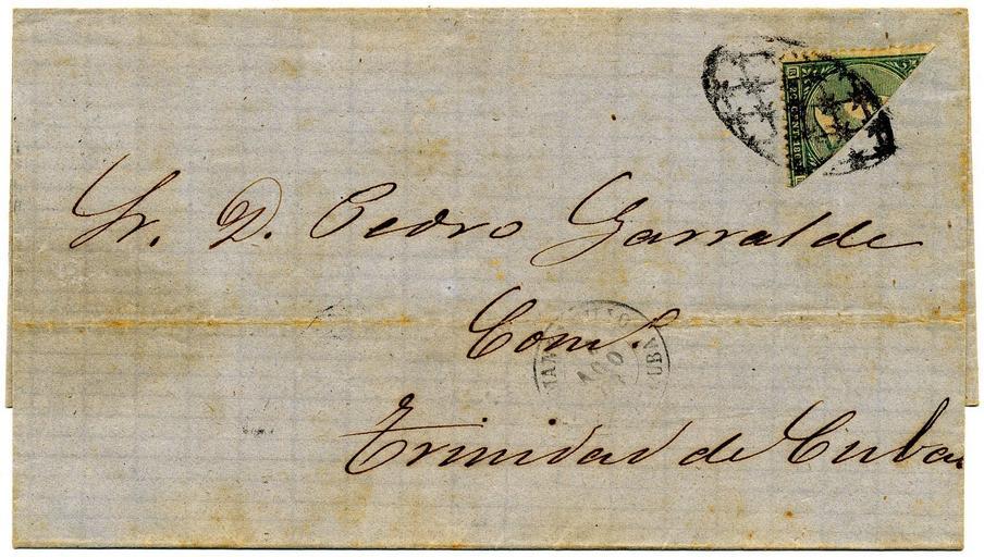 Keywords: 1868-Cuba-Bisect-Manzanillo-to-Trinidad.jpg en Cuban bisected stamp on folded letter no envelope Manzanillo to Trinidad 1868 Twenty céntimos de escudo stamp cut in two and used as 10 céntimos 1868 Spain for colony of Cuba - Scan of original owned by contributor Spain for colony of Cuba PD-old Uploaded with UploadWizard Stamps of Cuba Bisected stamps of Cuba |