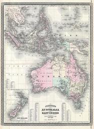 Keywords: 1870 Johnson Map of Australia, the East Indies, and Southeast Asia - Geographicus - Australia-johnson-1870.jpg This is A J Johnson ™s 1870 map of Australia the East Indies and Southeast Asia Covers from Modern day Thailand and Vietnam south to include all of the East Indies the Philippines New Guinea and the continent of Australia Offers superb detail with numerous islands states cities and geographical areas labeled and color coded Shows an advanced state of Australian exploration noting the explorations of Burke Wills Stuart and Gregory An inset in the lower left quadrant details New Zealand Text in the lower quadrants notes counties in each province of Australia Features the spirograph border common to Johnson ™s atlas work in 1870 This map appeared only in the 1867 “ 1870 run of Johnson ™s atlases and is consequently among Johnson ™s more uncommon maps Prepared by A J Johnson for publication as page nos 118 -119 in the rare 1870 edition of his New Illustrated Atlas ¦ Dated and copyrighted Entered according to Act of Congress in the Year of 1867 by A J Johnson in the Clerks Office of the District Court of the United States for the Southern District of New York 1867 dated Size in 17 5 23 5 object history credit line accession number Australia-johnson-1870 <i>Johnson's New Illustrated Family Atlas</i> 1870 edition Geographicus-source PD-old-100 Maps by Alvin Jewett Johnson 1867 maps Old maps of Australia Old maps of Indonesia |