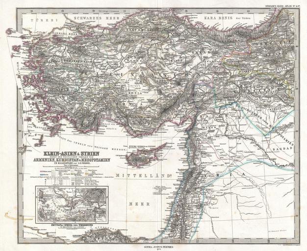 Keywords: 1873 Stieler Map of Asia Minor, Syria and Israel - Palestine (modern Turkey) - Geographicus - Klein-AsienSyrien-stieler-1873.jpg This is a beautiful example of Stieler ™s 1873 map of the modern day Turkey Syria Israel / Palestine and Cyprus Highly detailed with both political and physical data Shows cities mountains roads rivers and local divisions An inset in the lower left quadrant features the vicinity of Smyrna modern Ismir including depth sounding in the Gulf of Smyrna and harbor Printed to a high production standard as was typical of German and especially Perthes/Stieler maps of this period Published by the Justus Perthes firm and engraved by F Eulenstein and C Jungmann for issue as plate no 43 in the 1873 edition of Stieler ™s Hand-Atlas 1873 dated Size in 16 6 13 5 object history credit line accession number Klein-AsienSyrien-stieler-1873 <i>Stieler's Hand-Atlas</i> 1873 issue Geographicus-source PD-old-100 Old maps of the Middle East Old maps of Israel Old maps of Palestine Old maps of Syria Old maps of Turkey 1873 maps |
