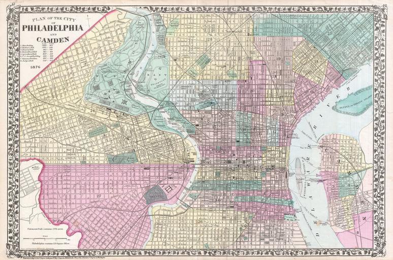 | Keywords: 1876 Mitchell Map of Philadelphia, Pennsylvania - Geographicus - Philadelphia-mitchell-1876.jpg A beautiful example of S A Mitchell Jr ™s 1876 folio map of Philadelphia Pennsylvania Covers downtown Philadelphia and adjacent Camden offering street detail on both sides of the Delaware and Schuylkill Rivers Names important buildings parks roads railways public work and military installations Color coded according to city wards Surrounded by the attractive vine motif border common to Mitchell atlases between 1866 and 1880 One of the more attractive atlas maps of Philadelphia to appear in the later 19th century Prepared by S A Mitchell Jr for inclusion as plates 42-43 in the 1876 issue of Mitchell ™s New General Atlas Dated and copyrighted Entered according to Act of Congress in the Year 1876 by S Augustus Mitchell in the Office of the Librarian of Congress in Washington 1876 dated Size in 22 15 object history credit line accession number Philadelphia-mitchell-1876 Mitchell Jr S A <i>Mitchell's New General Atlas</i> 1876 edition Geographicus-source PD-old-100 Maps by Samuel Augustus Mitchell Old maps of Philadelphia 1876 maps Philadelphia Wilmington and Baltimore Railroad |