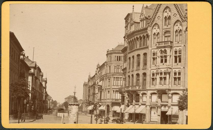 Keywords: 1877 Blick vom Café Robby (später Kröpcke) und Haus Heinemann in Hannover durch die Georgstraße Richtung Steintor, Bildseite CDV.jpg Blick im Jahr 1877 vom Standort des Café Robby später nach dem Oberkellner Wilhelm Kröpcke in Café Kröpcke umbenannt an der Ecke Bahnhofstraße/Rathenaustraße durch die Georgstraße in Richtung Steintor Die Georgstraße entstand ab 1788 durch die Enfestigung der Altstadt von Hannover und befand sich daher anfänglich in einer Randlage der noch mittelalterlich geprägten Stadt Daher erfolgte die Bebauung - trotz finanzieller Förderung durch die Stadtverwaltung - anfangs nur sehr zögerlich Ein Hinderungsgrund war auch die Auflage an potentielle Bauherren neue Gebäude nur in Massivbauweise zu errichten Erst nach der - zögerlichen- Entscheidung des Königs von Hannover zum Bau des ersten Eisen- Bahnhofs zunächst weit abgelegen auf einem Kartoffelacker in der dann von Georg Ludwig Friedrich Laves angelegten Ernst-August-Stadt Zitat rückte die Georgstraße als Querachse zwischen dem neuen Stadtteil und der alten Stadt in eine Zentrallage Die aus der Perspektive des Café Robby Kröpcke aufgenommene Fotografie von 1877 vermittelt trotz großstädtischer Bebauung noch den Eindruck einer beschaulichen Promenadenallee Das Zitat ist entnomen von Andreas Urban und Ute Ziegan Stadtbilder Hannover 1870 - 1900 dem Katalog zur gleichnamigen Ausstellung im Historischen Museum Hannover das die selbe Fotografie besitzt jedoch mit einem größeren Ausschnitt Etwa an der Stelle der in der Bildmitte erkennbaren Litfaßsäule wurde später die Kröpcke-Uhr aufgestellt Ganz rechts ist das Haus Heinemann zu sehen dahinter das Bahlsen-Haus in dem später Theodor Lessing wohnte Am rechten Bildrand ist der Vorbau des ehemaligen Polytechnikums zu sehen des Vorläuferbaus der heutigen Gottfried Wilhelm Leibniz Universität Hannover Hier brach später - nach der Ausrufung des Deutschen Kaiserreichs und der danach benannten Gründerzeit - der Bauunternehmer Ferdinand Wallbrecht die Karmarschstraße durch die erste durchgängige Querstraße durch Hannover für die Laves zuvor und noch im Königreich Hannover mehrfach vergeblich Pläne seinem König vorgelegt hatte Scan vom Original Bernd Schwabe in Hannover 1877 unidentified photographer 1877 Blick vom Cafe Robby später Kröpcke Richtung Steintor cropped jpg <gallery> File 1877 Blick vom Café Robby später Kröpcke und Haus Heinemann in Hannover durch die Georgstraße Richtung Steintor Rückseite CDV jpg Rückseite mit der Angabe ca 1880 </gallery> PD-old 1877 in Hannover Haus Heinemann Hannover Advertising columns in Hannover Kröpcke-Uhr Bahlsen-Haus Hannover Kröpcke-Center Hannover Rathenaustraße Hannover |