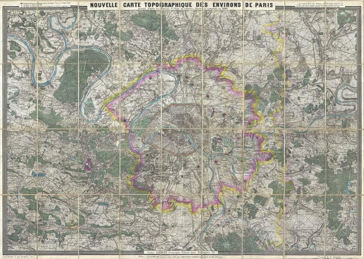 | Keywords: 1880 Clerot Pocket Map of Paris and Environs, France - Geographicus - Paris-clerot-1880.jpg Issued in 1880 by Victor Clerot this is one of the largest and most strikingly beautiful 19th century folding maps of Paris we have ever encountered Details the greater Paris vicinity from the Bois de Marechaux in the southwest Evesquemont in the northwest La Grange in the southeast and Les Tillieres near Dammartin in the northeast Map offers extraordinary detail throughout showing forests fields buildings gardens estates temples farms rivers roadways trains and topographical features Gardens forests the Seine and the official boundaries of Paris and beautifully colored in green pink and blue pastels The fortifications surrounding Paris built following the Franco-Prussian War and the brief Paris Commune period 1870s are particularly highlighted This map was issued in case or pocket format dissected into 36 sections and laid on linen for easy folding 1880 dated Size in 39 5 28 object history credit line accession number Paris-clerot-1880 Geographicus-source PD-100 Maps of Paris in the 19th century 1880 19th-century maps of Paris 1880 1880 maps Paris 1880 in Paris Map |