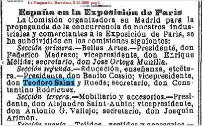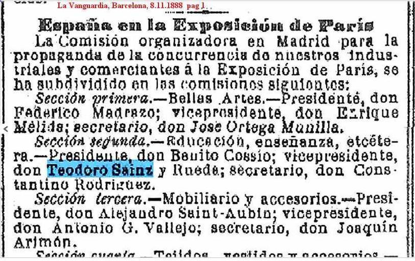 Keywords: 1888-Espana-en-la-exposicion-Paris-1889.jpg it Notizia della nomina della Commissione organizzatrice per la partecipazione di commercianti e industriali spagnoli alla Esposizione Universale di Parigi del 1889 1888-11-08 La Vanguardia Barcelona 8 11 1888 pag 1 La Vanguardia other versions La Vanguardia Barcelona 8 11 1888 pag 1 España en la Exposicion de Paris La Comision organizadora en Madrid para la propaganda de la concurrencia de nuestros industriales y comerciantes a la Exposicion de Paris se ha subdividido en las comisiones siguentes Seccion primera - Bellas Artes - Presidente don Federico Madrazo; vicepresidente don Enrique Melida; secretario don Jose Ortega Munilla Seccion segunda - Educacion enseñanza etcetera - Presidente don Benito Cossio; vicepresidente don Teodoro Sainz y Rueda; secretario don Constantino Rodriguez Seccion tercera - Mobilario y accessorios - Presidente don Alejandro Saint-Aubin; vicepresidente don Antonio G Vallejo; secretario don Joaquin Arimon Ecc PD-old Uploaded with UploadWizard La Vanguardia news Exposition Universelle 1889 Teodoro Sainz Rueda Federico de Madrazo y Kuntz Enrique Mélida José Ortega y Munilla 1888 in Madrid ImageNote 1 27 10 758 480 817 515 2 La Vanguardia Barcelona 8 11 1888 pag 1 ESPANA EN LA EXPOSICION DE PARIS La Comision organizadora en Madrid para la propaganda de la concurrencia de nuestros industriales y comerciantes a la Exposicion de Paris se ha subdividido en las comisiones siguentes Seccion primera - Bellas Artes - Presidente don Federico Madrazo; vicepresidente don Enrique Melida; secretario don Jose Ortega Munilla Seccion segunda - Educacion enseñanza etcetera - Presidente don Benito Cossio; vicepresidente don Teodoro Sainz y Rueda; secretario don Constantino Rodriguez Seccion tercera - Mobilario y accessorios - Presidente don Alejandro Saint-Aubin; vicepresidente don Antonio G Vallejo; secretario don Joaquin Arimon Ecc ImageNoteEnd 1 |