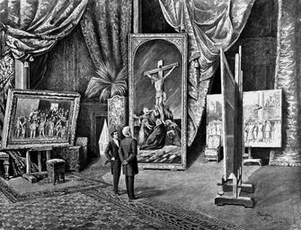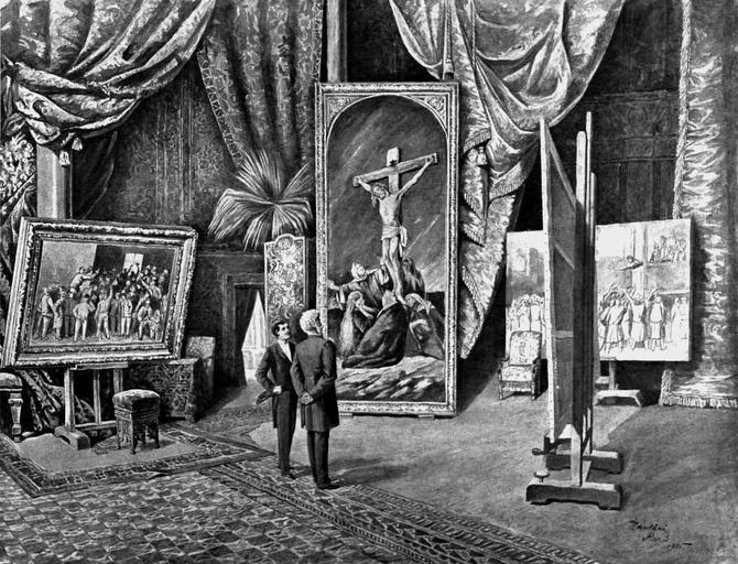 Keywords: 1895 Munkácsy műtermében.jpg hu Illusztráció 1895 április 14 Vasárnapi Ujság Kértem hogy mutassa meg újabb műveit s a mester körülvezetett a műtermében Legelőbb is a «Sztrájk»-ot néztük meg Ez Munkácsy legújabb festménye Egy sötét korcsmahelyiségben egy bőbeszédű népszónok asztalon állva erősen magyaráz valamit a hallgatóságnak Nagyon izgalmas és mozgalmas kép A szónok meggyőzni iparkodik a hallgatóságot állítása igazságáról s mint az arczokról leolvasható ez teljesen sikerül is neki mert a hadonázó alakok ököllel és kalaplengetéssel demonstrálják hogy a szónokkal tökéletesen egyetértenek A kép jobb oldala előterében ül egy munkás mellette sir neje kis lánya Elmerülve gondolkozik vajjon csatlakozzék-e a mozgalomhoz; neki családja van amelyet el kell tartania s ha nem dolgozik ma mit esznek holnap Az alakok nagyon jellegzetesek Sok szónokot láttam és sok hallgatót megfigyeltem de ilyen tőről metszett munkásvezért s ilyen hálás hallgatóságot még nem láttam soha Lehetetlen hogy tipikusabb népizgató legyen a valóságban Munkácsynak eleme a mozgó nyüzsgő sokadalom Csoportjai jó beosztásúak alakjai kifejezők előadása mesteri Minden esetre számottevő alkotás a mester genre-képei sorozatában Már teljesen készen van díszes keretbe foglalva áll a műteremben s az idei Szalonban lesz kiállítva Másolatban még nem jelent meg sehol sem Hogy nagy hatású lesz előre is bizton várható A «Sztrájk»-tól jobbra van már szintén keretbe foglalva «Krisztus és a kesergő asszonyok» czimű festménye mely Terebesre az Andrássy-mauzoleum számára készült Azt a jelenetet ábrázolja mikor Krisztus keresztre feszítése után a néptömeg eltávozik a szinhelyről s csak a rokonok maradnak vissza siratva a drága halottat Ez voltaképen a folytatása Munkácsy «Golgotha» czimű festményének de csak a tárgyánál fogva mert a helyzet egész más és új Óriási terjedelmű kép életnagyságú alakokkal E festménynél a mester újból egész tökéletességében láttatja művészetét s azt a rendkívüli világító erőt mely az ő képeit oly sajátszerűen jellemzi Csoportosítása kerekded s egy részről a pompás színezés más részről magának a kompozicziónak arányos harmóniája gyönyörködtet benne Munkácsy legújabb festményének czíme «Ecce homo» s azt a jelenetet ábrázolja mikor a kiváncsi tömegnek egy erkélyről fölmutatják Krisztus holttestét Még csak vázlat ugyan s még úgy is csak megkezdés mert az alakok csupán körvonalakban vannak megrajzolva s a világossági masszák a sötét tónusoktól egy szinnel elválasztva; de már e könnyen odavetett rajzban is benne van a tragédiai hatás Fent az erkélyen Krisztus holtteste körülötte a közömbös pribékek s alant a tolongó nyüzsgő kiabáló ujjongó és kíváncsi néptömeg mutatja hogy itt valami rendkívül fontos és az egész közönséget egyetemesen érdeklő dolognak kellett történnie Szánthai István Forrás Vasárnapi Ujság 1895 április 14 1895 http //www epa oszk hu/00000/00030/02145/pdf/02145 pdf Szánthai István other versions pd-old Uploaded with UploadWizard Mihály von Munkácsy |