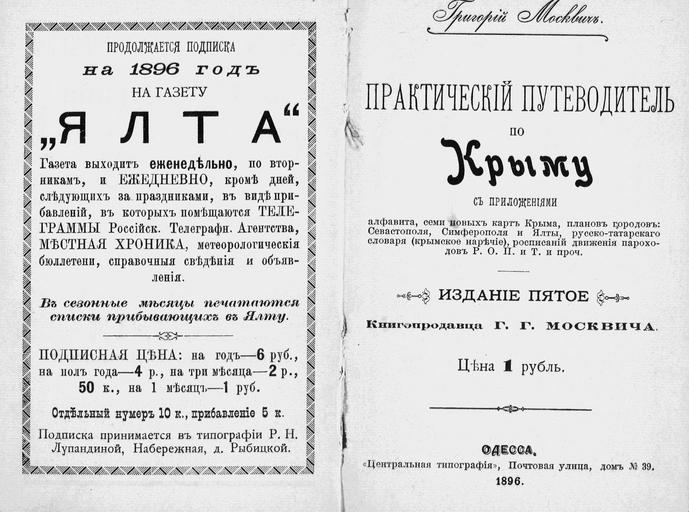 | Keywords: гаспринский словарь крымские татары крымскиетатары 1896 путеводитель крым crimea dictionary guide book guidebook rsl ргб blackandwhite monochrome text document writing black and white Москвич, Григорий Георгиевич. Практический путеводитель по Крыму / Григорий Москвич. - 5-е изд. - Одесса : Г.Г. Москвич, 1896. - XI, 500 с., 9 л. карт. : ил.; 16. Авт. указан в предисл. С 6-го изд. загл.: Иллюстрированный практический путеводитель по Крыму Источник: search.rsl.ru/ru/record/01003639696 Во втором издании словаря нет. По предисловию - в 5-м он появляется впервые Москвич, Григорий Георгиевич. Практический путеводитель по Крыму / Григорий Москвич. - 5-е изд. - Одесса : Г.Г. Москвич, 1896. - XI, 500 с., 9 л. карт. : ил.; 16. Авт. указан в предисл. С 6-го изд. загл.: Иллюстрированный практический путеводитель по Крыму Источник: search.rsl.ru/ru/record/01003639696 Во втором издании словаря нет. По предисловию - в 5-м он появляется впервые |