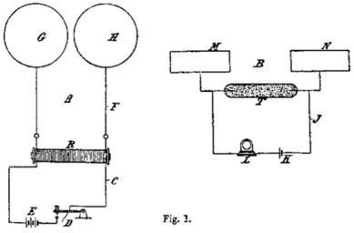 Keywords: 1896 Marconi patent.gif en In this diagram A is the transmitting instrument and B is the receiving instrument placed at say ¼ mile apart In the transmitting instrument R is an ordinary induction coil a Ruhmkorff coil or transformer Its primary circuit C is connected through a key D to a battery E and the extremities of its secondary circuit F are connected to two insulated spheres or conductors G H fixed at a small distance apart When the current from the battery E is allowed to pass through the primary of the induction coil sparks will take place between the spheres G H and the space all around the spheres suffers a perturbation in consequence of these electrical rays or surgings The arrangement A is commonly called a Hertz radiator and the effects which propagate through space Hertzian rays <br> The receiving instrument B consists of a battery circuit J which includes a battery or cell K a receiving instrument L and a tube T containing metallic powder or filings each end of the column of filings being also connected to plates or conductors M N of suitable size so as to be preferably tuned with the length of wave of the radiation emitted from the transmitting instruments The tube containing the filings may be replaced by an imperfect electrical contact such as two unpolished pieces of metal in light contact or coherer c The powder in the tube T is under ordinary conditions a non-conductor of electricity and the current of the cell K cannot pass through the instrument; but when the receiver is influenced by suitable electrical waves or radiation the powder in the tube T becomes a conductor and remains so until the tube is shaken or tapped and the current passes through the instrument <br> By these means electrical waves which are set up in the transmitting apparatus affect the receiving instrument in such a manner that currents are caused to circulate in the circuit J and may be utilised for deflecting a needle which thus responds to the impulse coming from the transmitter <br> Dans ce schéma A est l'instrument de transmission et B est l'instrument de réception mis à part dire ¼ mile Dans les appareils d'émission R est une bobine d'induction ordinaire une bobine de Ruhmkorff ou transformateur Sa C du circuit primaire est connecté via une clé D à un E de la batterie et les extrémités de ses F circuit secondaire sont connectés à deux sphères isolées ou GH conducteurs fixé à une petite distance Lorsque le courant de la batterie E est autorisé à passer par le primaire de la bobine d'induction des étincelles se tiendra entre les sphères GH et l'espace tout autour de la sphère subit une perturbation à la suite de ces rayons électriques ou surgings Le schéma A est communément appelé un radiateur Hertz et les effets qui se propagent dans l'espace hertzien rayons <br> L'appareil récepteur B se compose d'un circuit de batterie J qui comprend une batterie ou pile K un instrument de réception de L et un tube T contenant de la poudre métallique ou dépôts chaque extrémité de la colonne de dépôts étant également reliés à des plaques ou des conducteurs de MN taille appropriée de manière à être à l'écoute de préférence avec la longueur d'onde du rayonnement émis par les instruments de transmission Le tube contenant les documents peuvent être remplacés par un contact imparfait électriques tels que deux pièces de métal mat en léger contact ou cohéreur c La poudre dans le tube T est dans des conditions normales un non-conducteur de l'électricité et le courant de la cellule K ne peut pas passer à travers l'instrument mais lorsque le récepteur est influencée par appropriés ondes électriques ou de radiations de la poudre dans le tube T devient un chef d'orchestre et le demeure jusqu'à ce que le tube est secoué ou taraudé et le courant passe à travers l'instrument <br> Par ces moyens les ondes électriques qui sont mis en place dans les appareils de transmission affectent l'appareil récepteur de telle manière que les courants sont mis en circulation dans le circuit de J et peut être utilisé pour dévier une aiguille qui répond ainsi à l'impulsion provenant de la émetteur <br> http //www radiomarconi com/marconi/popov/pat763772 html Guglielmo Marconi 1874 - 1937 1896 PD-Old 1896 in radio Guglielmo Marconi Coherers Spark-gap transmitter circuits |