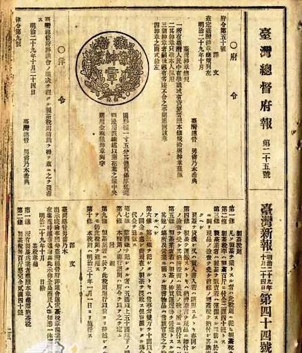 Keywords: 1896 October Gazette of the Governor-General of Taiwan 明治29年10月臺灣總督府報-臺灣紳章條規.jpg zh-tw 1896-10-24 2013-10-14 08 38 04 http //catalog digitalarchives tw/item/00/48/84/a9 html Japanese Government PD-Japan-exempt<br>PD-ROC-official Officail text of Government-General of Taiwan Uploaded with UploadWizard PD-Japan-exempt PD-1996 Japan |