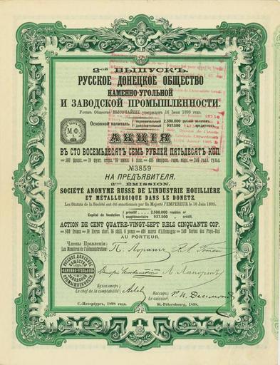 | Keywords: 1898. Русское донецкое общество каменноугольной и заводской промышленности. Акция в 187 рублей 50 копеек (второй выпуск).jpg Русское донецкое общество каменноугольной и заводской п омышленности Акция в 187 ублей 50 копеек вто ой выпуск http //infodon org ua/postal/269 1898 author PD-RusEmpire Stock certificates from Donetsk Oblast Files uploaded by Andrew Butko from various sources 19th century Images from infodon org ua | ||||