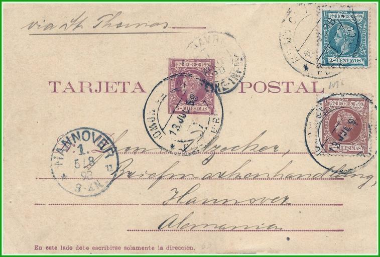 Keywords: 1898-Puerto Rico-5m-PostalCard-UsedGermany.jpg en 1898 5 milesimas postal card uprated with 2 1/2 centavos adhesive stamps to Germany Spanish government for colony of Puerto Rico 1898 Spanish government for colony of Puerto Rico 1898 1898 PD-old Postal stationery of Puerto Rico |
