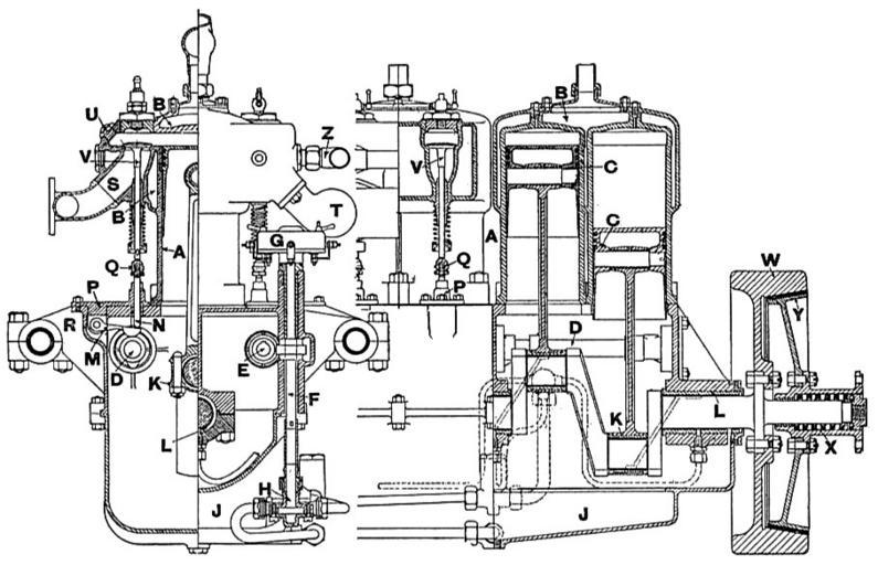 | Keywords: 18-24hp Enfield engine, side-section (Heat Engines, 1913).jpg - A cylinders - B water jackets - C pistons - D inlet camshaft - E exhaust camshaft - F distributor and lubrication pump driving shaft - G high tension distributor - H lubrication pump - J crank chamber oil sump - K big end - L main bearing - M valve tappet rocker arm - N valve tappet - P plate carrying tappet rocker and tappet guide - Q adjustable tappet head - R aluminium supporting arms - S inlet pipe - T exhaust pipe - U hole for second sparking plug - V valves - W flywheel - X clutch spring - Y leather clutch - Z water inflow pipe 18-24hp Enfield engine lubrication system diagram Heat Engines 1913 jpg Cone clutches Petrol engines Vintage car engines Monobloc engines cylinder head Monobloc engines non-monobloc cylinder block |