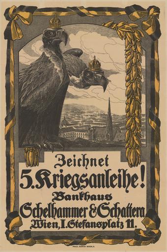 | Keywords: 18 Sammlung Eybl Österreich-Ungarn. Herbert Rendl. Zeichnet 5. Kriegsanleihe! 1916. 95 x 63 cm. (Slg.Nr. 592).jpg Österreich-Ungarn Herbert Rendl Zeichnet 5 Kriegsanleihe 1916 95 x 63 cm Slg Nr 592 Neben Fahnen waren die Wappentiere die beliebtesten Symbole Dieses Plakat zeigt den Doppeladler der österreichisch-ungarischen Monarchie und im Hintergrund Wien mit dem Stephansdom Als Zeichen der Siegesgewissheit zieren Lorbeeren das Bild Umrahmt wird es von einem Band in den traditionellen Farben des Hauses Habsburg Austria-Hungary Herbert Rendl 5 Draw war loan 1916 95 x 63 cm Slg Nr 592 In addition to the flags heraldic animals were the most popular symbols This poster shows the double-headed eagle of the Austro-Hungarian Empire and in the background Vienna with St Stephen's Cathedral As a sign of the certainty of victory laurels adorn the image Surrounded there is a band in the traditional colors of the Habsburg dynasty Sammlung Eybl Plakatmuseum Wien 2015-09-17 10 30 36 A Erhardt Credit line Eybl Plakatmuseum Wien/Wikimedia Commons CC-BY-SA-4 0 wiki Sammlung Eybl Plakatmuseum Wien PD-old-100-1923 World War I posters of Austria-Hungary War bonds Plakatmuseum Wien Eybl Collection Quality images by Hubertl QualityImage |