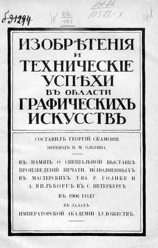 Keywords: Скамони, Георгий Николаевич (1835-1907). Изобретения и технические успехи в области графических искусств / Сост. Георгий Скамони; Пер. П.М. Ольхина. - Санкт-Петербург : т-во Р. Голике и А. Вильборг, [1906]. - 60 с. : ил.; 23. - (В память о специальной выставке произведений печати, исполненных в мастерских товарищества Р. Голике и А. Вильборг в Санкт-Петербурге в 1906 г. в залах Академии художеств). На обл. авт. не указан Источник: РГБ - <a href="http://dlib.rsl.ru/rsl01003000000/rsl01003738000/rsl01003738865/rsl01003738865.pdf" rel="nofollow">dlib.rsl.ru/rsl01003000000/rsl01003738000/rsl01003738865/...</a> 1906 rsl перевод типография russianstatelibrary ргб полиграфия электронныйресурсргб историяпечати скамони голикеивильборг