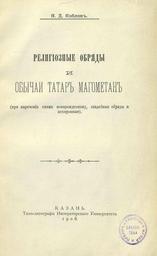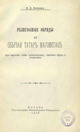 Keywords: Коблов, Яков Дмитриевич (1876-). Религиозные обряды и обычаи татар магометан (при наречении имени новорожденному, свадебные обряды и похоронные) : [Доложено общ. собранию 14 дек. 1908 г.] / Я.Д. Коблов. - Казань : типо-лит. Имп. ун-та, 1908. - 46 с.; 26. В конце текста авт.: действ. чл. Я. Коблов <a href="http://dlib.rsl.ru/rsl01003000000/rsl01003749000/rsl01003749406/rsl01003749406.pdf" rel="nofollow">dlib.rsl.ru/rsl01003000000/rsl01003749000/rsl01003749406/...</a> 1908 ленинка ргб оцифровка противомусульманскаямиссия электронныйресурсргб историяказани коблов историятатарстана