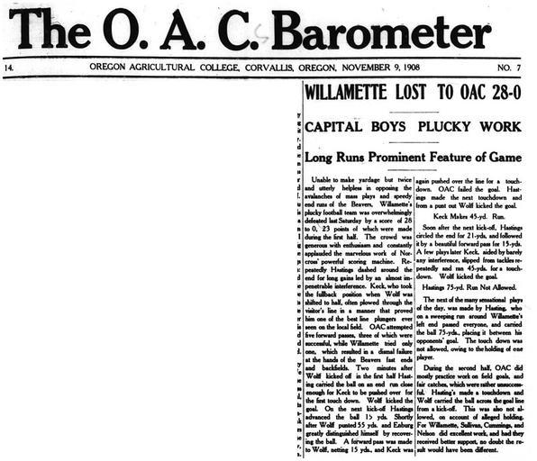 | Keywords: 1908 Beavers Reference.jpg en This 1908 article from the O A C Barometer is the earliest known reference to the Oregon State Beavers The team usually was known as the Aggies until several years later Most sources incorrectly identify 1916 as the first known reference The O A C Barometer Oregon Agricultural College Oregon State University The O A C Barometer no author printed file created from microfilm 1908-11-08 PD-old This image was scanned from microfilm at the Oregon State University Library PD-old-100 1908 newspapers 1908 in Oregon |