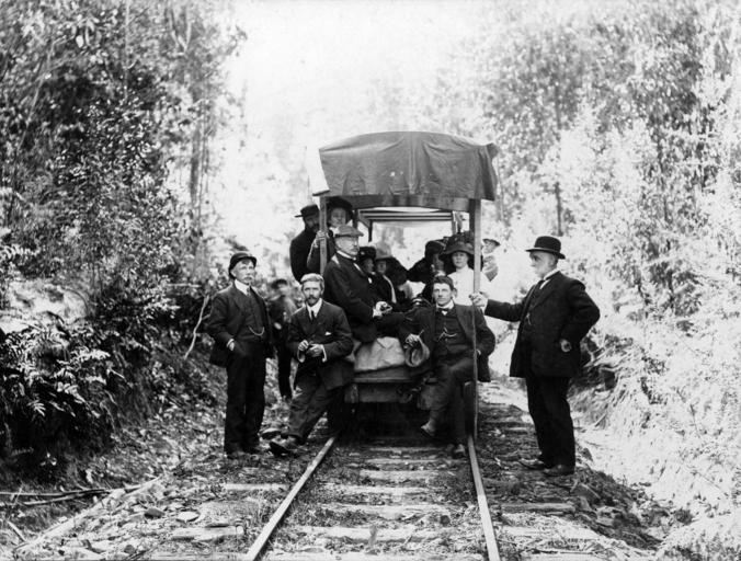 Keywords: tasmania blackandwhite monochrome outdoor black and white Visit of Governor and Lady Barron to Port Esperance. On the Hopetoun tramway. Warden Clennett holding dead snake. E King photo Visit of Governor and Lady Barron to Port Esperance. On the Hopetoun tramway. Warden Clennett holding dead snake. E King photo |
